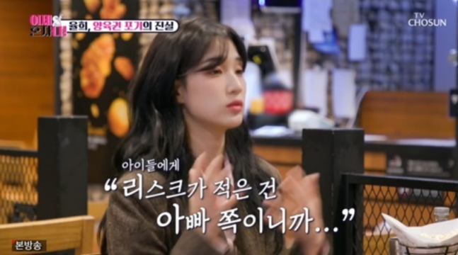 율희 : 그건 이번 연초 얘기했던 문제라 다르게 생각했어. 그땐 오빠가 잘못했으니 '최대한 할 수 있는 걸 해줄게' 라고 느꼈고, 이번 이혼 문제는 오빠가 꺼냈기 때문에 오히려 내가 요구할 수가 없었어. 내 문제가 커서 오빠가 먼저 얘기 나온건데, 거기서 현실 상황 아는데....