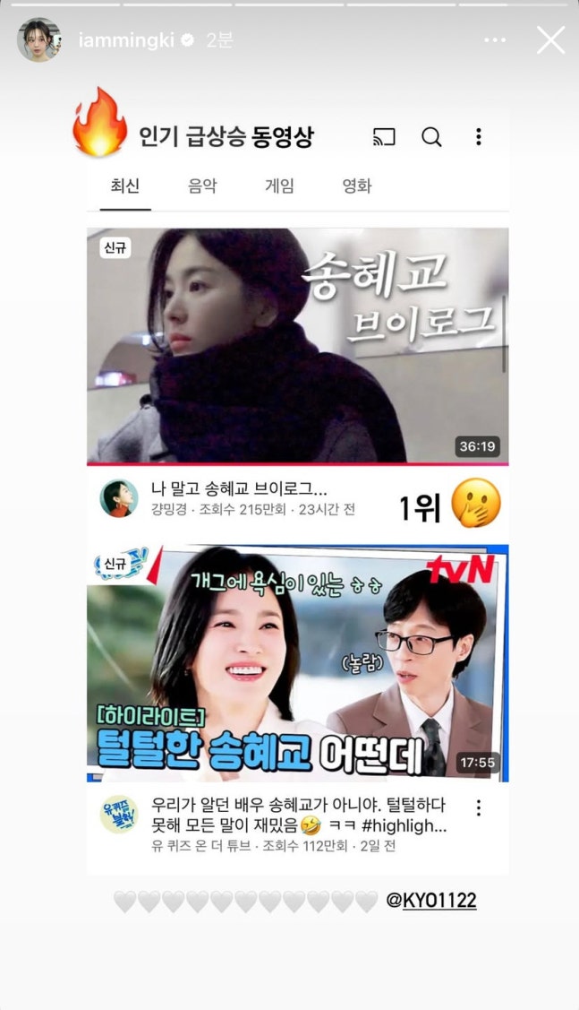 송혜교는 '유퀴즈' 출연분의 모든 클립을 유튜브 내 인기 급상승 동영상 순위에 올린 것에 이어 강민경의 유튜브 채널을 통해서 공개한 브이로그까지 '인급동' 1위에 올리면서 화제성을 증명했다.