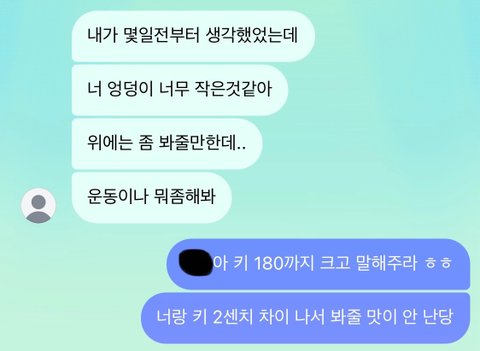 갑자기 한남 발언하길래 일단 보내놧는데 뭐라고 더 말하면서 헤어질까? ㅠㅠ 원래 한남끼 안 보였는데 오늘 오전에 만나고 밤에 이렇게 오니까 너무 당황스럽다...