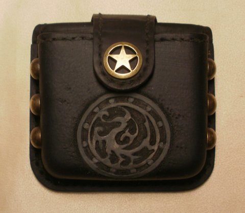 가죽에 삼족오 디자인을 카빙하고 천연 염색하여 제작한 핸드메이드 벨트용 천연 가죽 폰 케이스(Z플립 케이스)입니다.(마디샤 가죽공예)