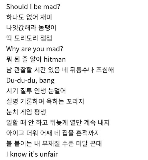 가사에는 다음과 같은 이야기가 담겼다. “하나도 없어 재미 / 나잇값해라 놈팽이”, “뭐 된 줄 알아 hitman / 남 관찰할 시간 있음 네 뒤통수나 조심해 / Du-du-du, bang”, “시기 질투 인생 눈멀어 / 실명 거론하며 욕하는 꼬라지”, “아이고 더워 어째 네 집을 흔적까지 / 불 붙이는 내 부채질 / 수준 미달 꼰대”