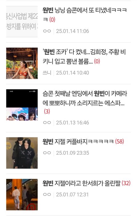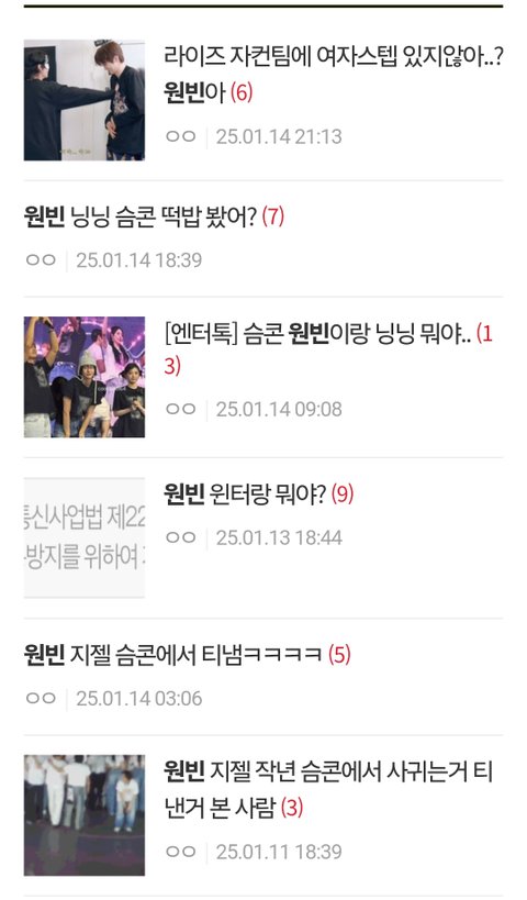 원빈이 그누구도안사귀는건 저 정병 본인이 제일 잘아는건 확실함ㅋㅋ왜냐하면 하루에도 지젤 닝닝 윈터 한번에 엮어버리고 가끔 카리나 좋아한다고도 엮음ㅋㅋ주로 에스파랑 엮지만 다른걸그룹 다수도 엮음 그뿐만 아니라 온갖루머도 만들어서 도배하고 쟤는 그냥 원빈까는걸 스포츠처럼 하는얘임 1년넘게 원빈관련 악의적인글만 몇백개씩 쓰는 인간말종임