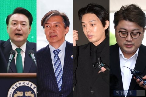 왼쪽부터 윤석열 대통령, 조국 전 조국혁신당 대표, 배우 유아인, 가수 김호중/사진=대통령실, 뉴스1, 한경DB