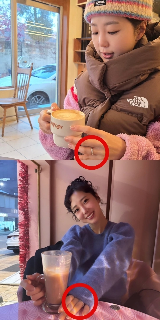 특히나 약지에 낀 반지가 눈길을 끈다. 반지는 다른 사진에서도 다수 확인할 수 있다. 지난해 10월 초부터 방송과 소셜 계정을 통해 반지를 낀 채로 대부분의 촬영에 나서고 있다.