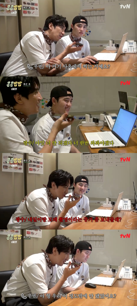 이날 이광수는 일손이 부족하자 김우빈에게 전화를 걸어 "오늘 도경수랑 너무 재미있다. 이제서야 내게 꼭 맞는 옷을 입었다"고 너스레를 떨었다.