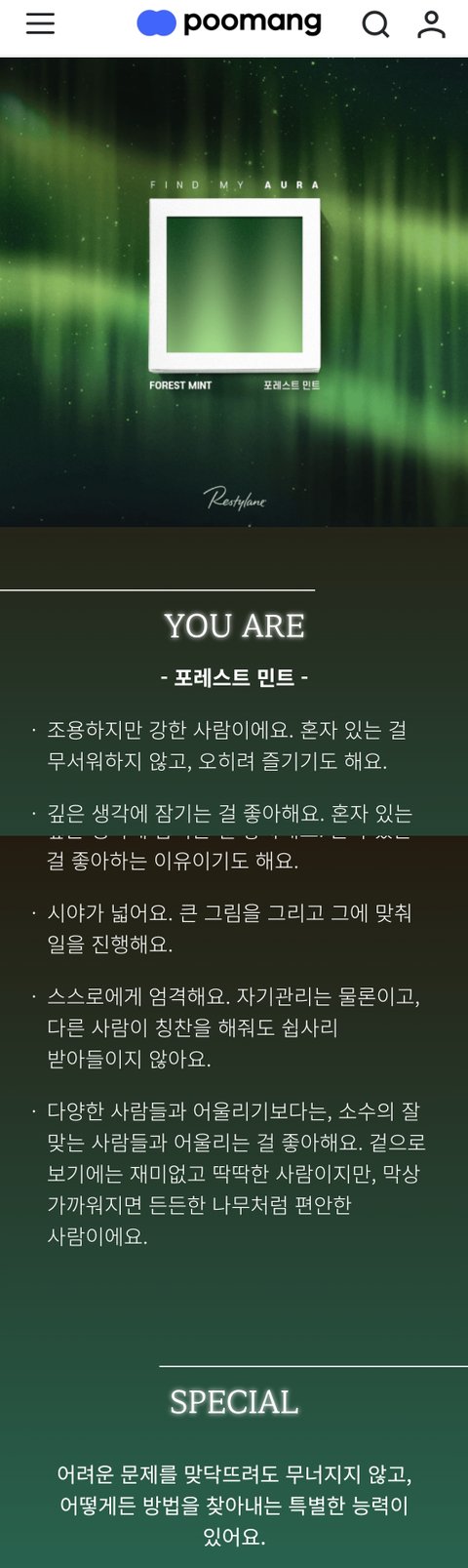 푸망poomang에 들어가서 아우라 검색하고 테스트 봐봐!! 진짜 정확하고 신기해!난 이렇게 나왔엉 너도 너만의 아우라 찾아봐 테스트도 간단하고 좋당ㅎ