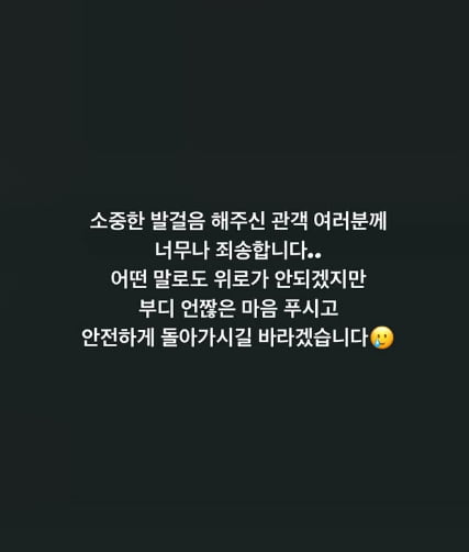 SNS주연 배우인 민우혁(유일형 역)은 공연 직후 자신의 계정에 "소중한 발걸음 해주신 관객 여러분께 너무나 죄송하다. 어떤 말로도 위로가 안 되겠지만 부디 언짢은 마음 푸시고 안전하게 돌아가시길 바라겠다"고 글을 올렸다.