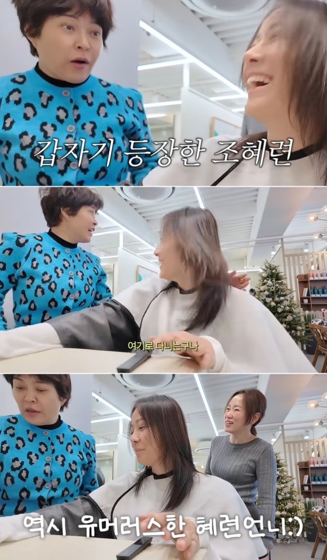 채널 ‘Mrs.뉴저지 손태영’ 캡처이날 손태영은 단골 미용실을 찾아 머리를 잘랐다. 대기하던 도중, 같은 숍에 다니는 조혜련이 깜짝 등장해 이목을 끌었다.