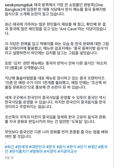 방콕 쇼핑몰에서 한식을 중식으로 훔쳐 팔음
