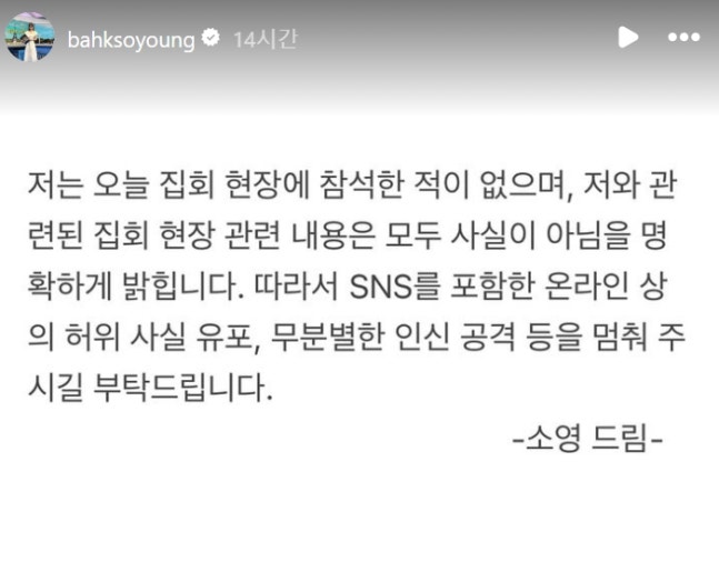 19일 박소영 아나운서는 자신의 SNS 계정 스토리에 "오늘 집회 현장에 참석한 적이 없으며, 저와 관련된 집회 현장 관련 내용은 모두 사실이 아님을 명확하게 밝힌다"라고 적었다.