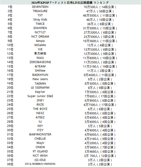 2024년 케이팝 아티스트 일본 LIVE공연 관객동원 순위