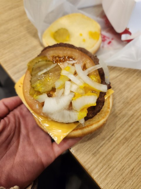 양파 정량 보다 훠~~얼씬 많이 얹어준거라는 심지어 토마토 토핑도 600원 내고 추가 주문한 5900원짜리 클래식치즈버거의 상태입니다. 치즈는 그냥 생슬라이스치즈 한장 올려져 버거는 차갑습니다. 항상 비루하다 시피 했었어도 이건 정말 아니다 싶어 고객센터에 전화했더니 햄버거에 아무런 문제가 "없어보인다" 라고만 AI인공 지능처럼 되뇌입니다. 소비자는 일원 단위로 칼같이 돈 지불하고 취식하는데 대체 언제부터 아래 사진의 햄버거가 정량 이상을 올려준 토핑의 기준이 된거죠? 요즘 프렌차이즈들, 특히 버거전문점들 내용물 부실해져 가는거 정말 심각합니다. 값은 오르는데 토핑은 되려 듬성듬성 넘어가는 실태. 소비자기만 허위광고로 신고하고 싶은데 가능한가요? 위에는 롯***에서 제공하는 클래식치즈버거의 표본입니다.