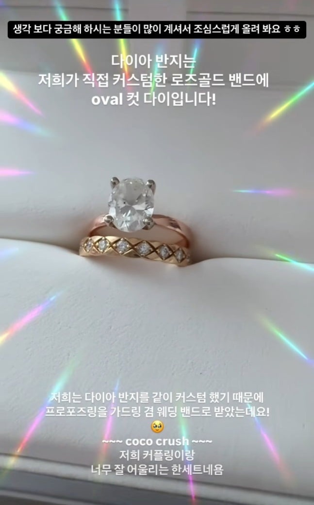 결혼을 앞둔 가수 에일리가 방송을 통해 화제가 된 자신의 결혼 반지에 대해 솔직하게 고백했다.에일리는 지난 19일 자신의 인스타그램 스토리에 "생각보다 궁금해하시는 분들이 많아서 조심스럽게 올려봐요"라며 "다이아 반지는 저희가 직접 커스텀한 로즈골드 밴드에 oval컷(랩다이아몬드 반지) 다이입니다"라고 밝히면서 사진 한 장을 게재했다.