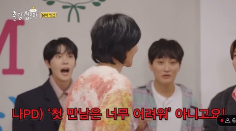 원빈이 투어스 제목 틀려서 뒤돌아보니까 카리나가 원빈보고 “왜 나한테 물어봐” 라며 반말