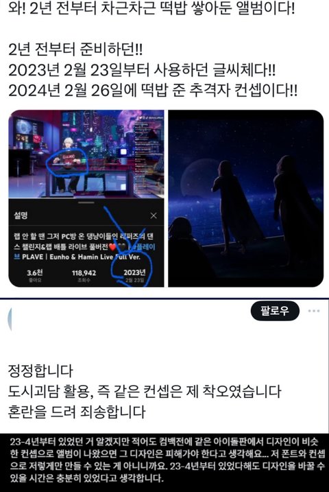 재밌어서 구경갔는데 플이 먼저 쓰던 떡밥인데 나중에 낸 앨범이랑 겹쳤으니 플보고 바꾸라고 하는거 맞음? 공론화한 ㅈㅎ팬은 글삭튀함