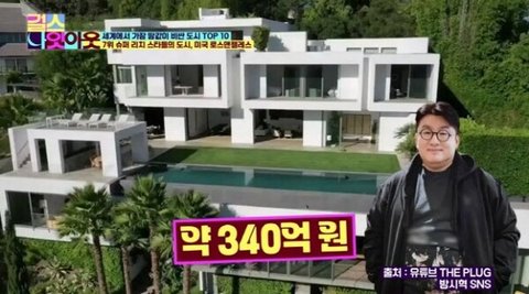 방시혁 의장이 미국 코미디언 트레버 노아에게서 구매한 이 집은 약 309평 생활공간에 지상 3층 규모로 이뤄진 대저택이다. 침실 6개, 욕실 9개, 도서관, 체육관, 인피니티 풀, 사우나, 옥상 테라스, 야외 주방 등 고급 시설이 들어서 있는 것으로 알려졌다.