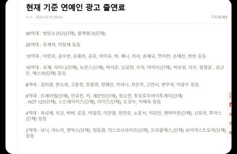 방탄 21.22년도 단체 광고료 최저가 50억즈음이였고 최고가 100억대였음. 것도 코로나로 다들 힘들때라 광고료 20프로 자진삭감 했던 금액임. 25년 완전체 활동하면 그 금액보다 많으면 많았지 적진 않을듯