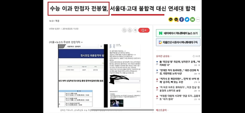 2014년에 수능 유일하게 이과 만점받은 학생이 서울대, 고대 떨어지고 연대 겨우 붙었다고 합니다...