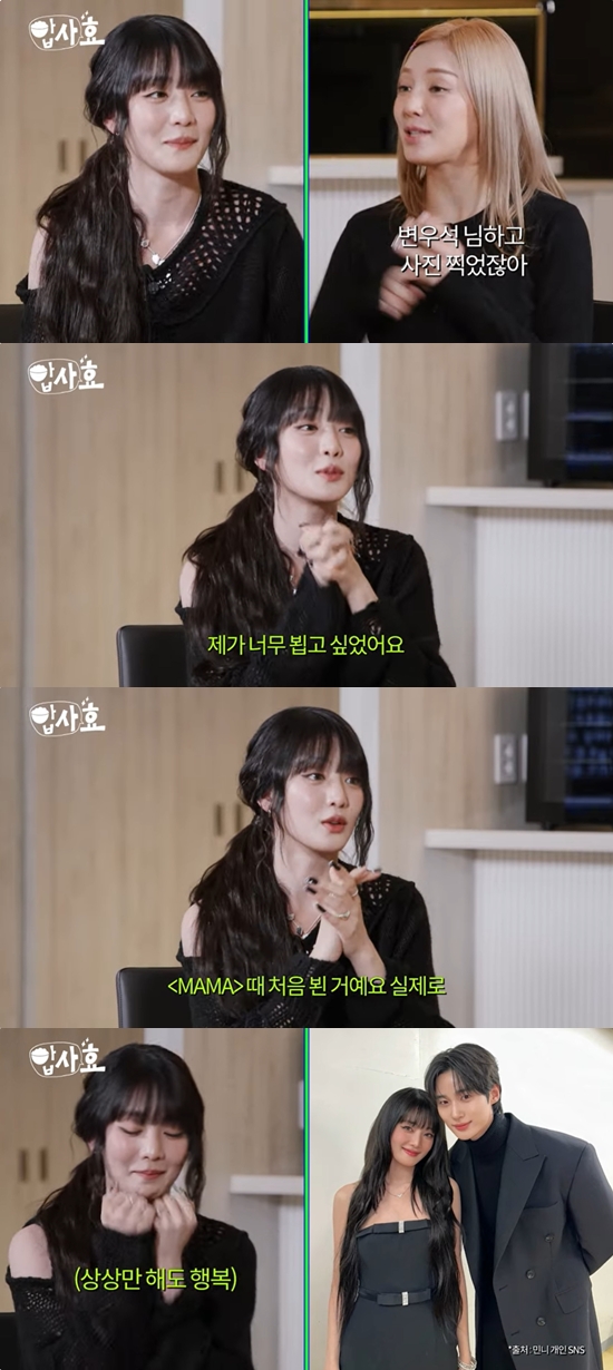 민니는 "이렇게 지나가면서 눈이 마주쳐서 (제가) '안녕하세요'라고 하고 변우석 님께서 고맙다고 먼저 얘기하셨다. 그래서 '혹시 이따가 시간되면 사진 한 장 찍어 되나요?'라고 하고 (변우석은) '네네네' 하고 찍었다"고 비하인드를 전했다.
