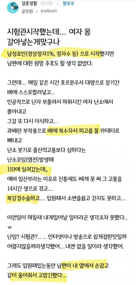 난자 긁고 난 다음날.... 명치부터 허벅지 전체가 피멍이 든 내 모습을 보고 출근하려다 펑펑 울었던 기억이 난다... 진짜 남자들은 여자가 쉽게 임신하는 줄 아는 것 같은데 진짜 상대하고 싶지도 않다..