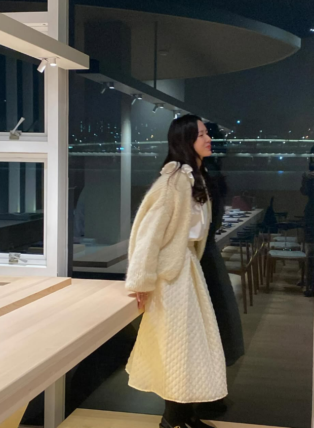 손예진은 흰색 퍼 자켓과 흰색 후드 티셔츠, 패딩 치마를 입고 따뜻하면서도 러블리한 겨울룩을 선보였다. 특히 자연스러운 헤어과타일과 화장기 없는 얼굴에도 뚜렷한 이목구비를 자랑하기도.