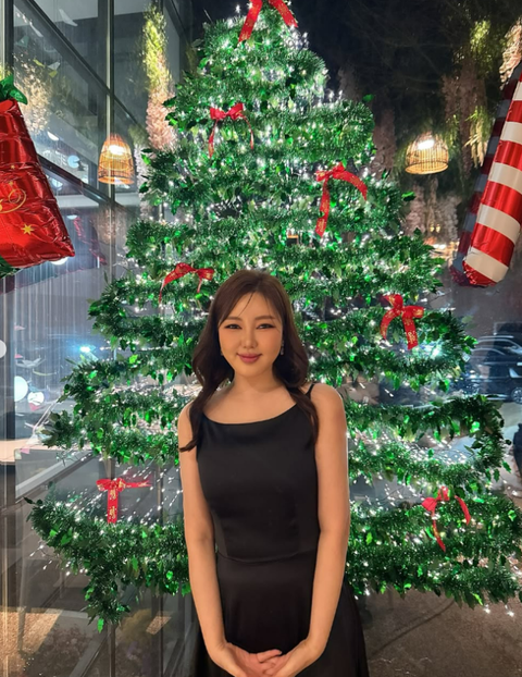 사진 속 송가인은 크리스마스 트리 앞에서 검정색 민소매 원피스를 입고 포즈를 취하고 있다. 송가인은 여리여리한 원피스 핏과 직각 어깨로 슬림한 몸매를 드러냈다.