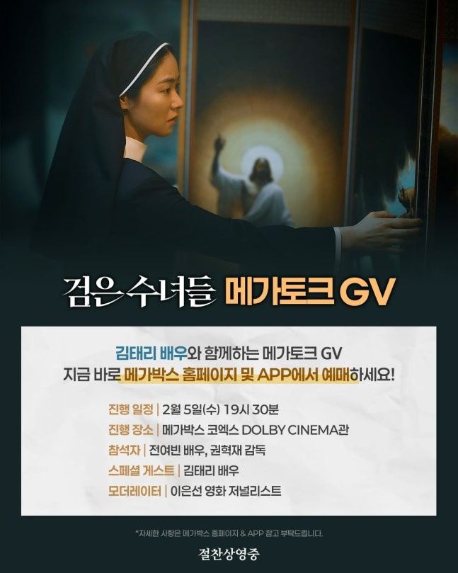 영화 '검은 수녀들'의 전여빈과 스페셜 게스트 김태리가 함께하는 메가토크 GV가 오는 2월 5일 메가박스 코엑스에서 개최된다.