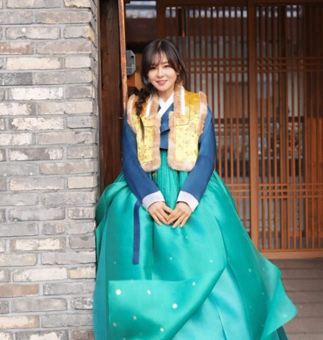 최강희 소셜미디어사진 속 최강희는 남색, 청록색의 한복을 입고 노란색 털 조끼를 입은 후 한쪽으로 머리를 땋은 채 동안 미모를 자랑하고 있다.