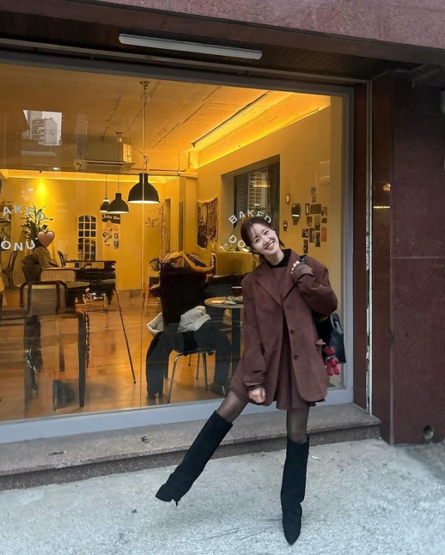 브라운 재킷과 블랙 원피스를 매치한 감각적인 스타일링에 블랙 롱부츠와 가방을 더해 세련된 분위기를 자아냈으며, 자연스럽게 묶은 헤어스타일은 그녀의 또렷한 이목구비를 더욱 돋보이게 했다.