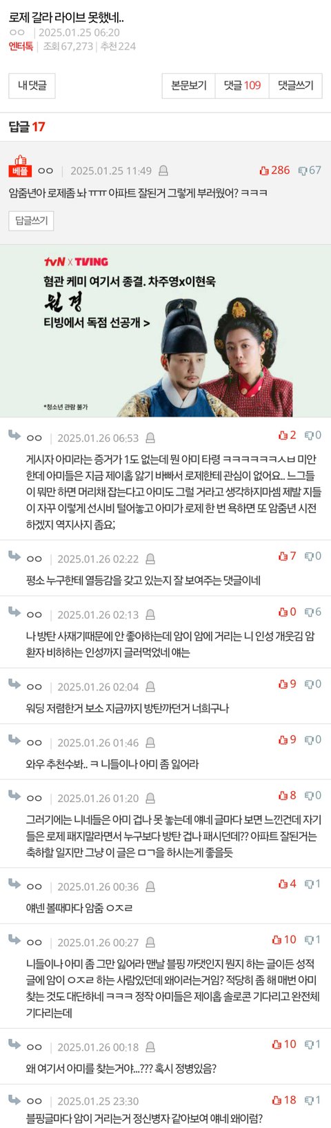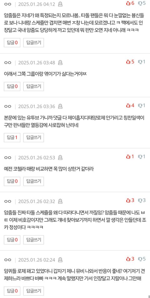 어그로 글에서 왜 아미찾고 방탄까고 난리임? 외퀴자정되는 판 없고 니네 외퀴도 자정 안 돼서 맨날 방탄 처 패는거 모름? 국내아미들은 제이홉 앓느라 니네 관심도 없는데 왜그래? 얘넨 외퀴도 아니고 베댓 바꾼 추천수 보면 니네 국내블링크들이 오히려 방탄 패는거잖아 로제 무대 안 봤고 관심없는데 왜 아미 방탄 패고 ㅈㄹ임? 매번 니네 글 ㅈㄹ나면 이러는데 이번엔 너무 심해서 가져왔음