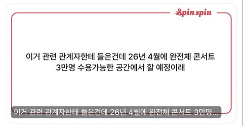 이거 찐이면 넘 작은 거 아니냐 고척이 플로어 좌석 어케 하냐에 따라서 3만명 근접하게는 가능하다는데 공연장 생각하니까 ㅈㄴ 노답이네 저때는 또 K리그 개막+2026 월드컵 대비 평가전도 있을 예정이라 상암은 더더더 못빌림 잔디때문에 이미 막아놓긴 했지만