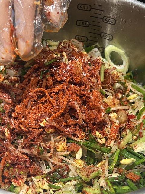 참치액젓 또는 멸치액젓 다진마늘 고추가루 매실청 다시다살짝