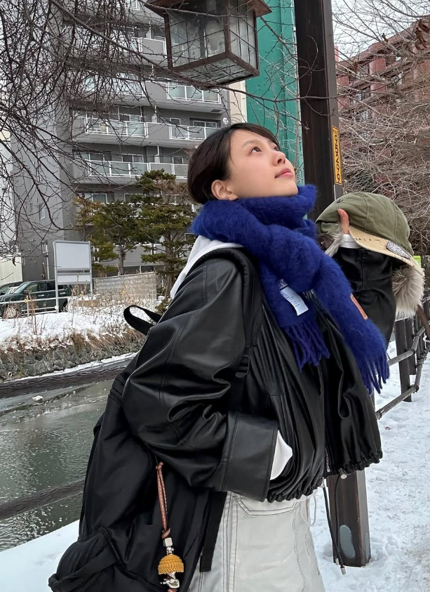 사진 속 고민시는 검정색 가죽 재킷을 입고 파란색 목도리를 두른 채 한 손에는 털모자를 들고 있는 모습이다. 고민시는 카메라를 향해 미소짓는가 하면, 어딘가를 올려다 보며 포즈를 취하고 있다.