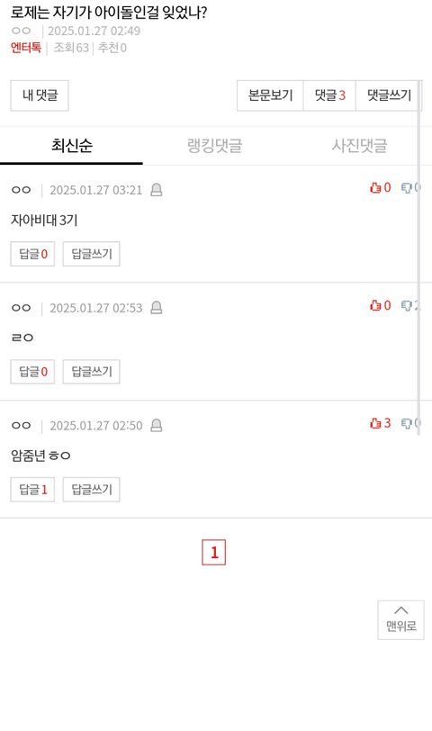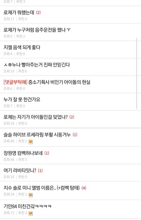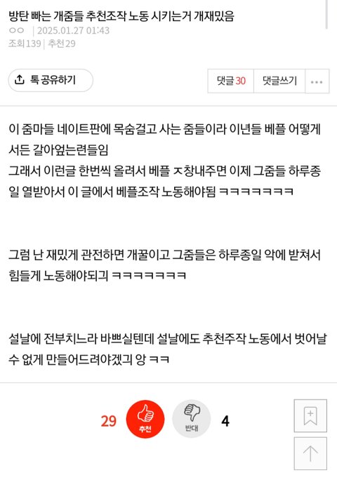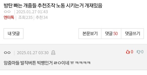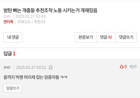새벽이라 사람 없어 조회수 추천 비추 나오지도 않는데 지디글이랑 매일 오는 로제 이용해서 방탄팬 까는글만 추천수 비슷함