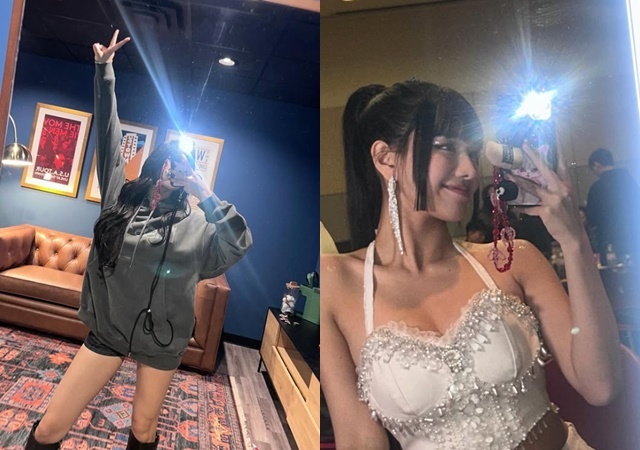 나띠 소셜미디어사진 속 나띠는 박시한 오프숄더 티셔츠에 망사 스타킹을 신고 힙한 매력을 드러내는가 하면 후드 스타일링, 반전 매력의 무대의상 등을 입고 포즈를 취하고 있다.