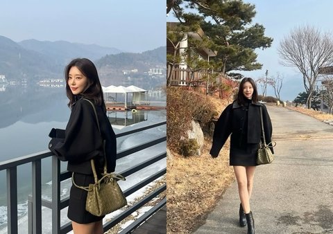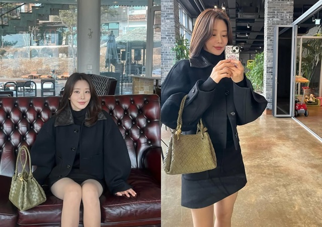 사진 속 이주빈은 블랙 하프코트에 미니스커트를 입고 근교 카페를 찾아 휴식을 즐기고 있다.