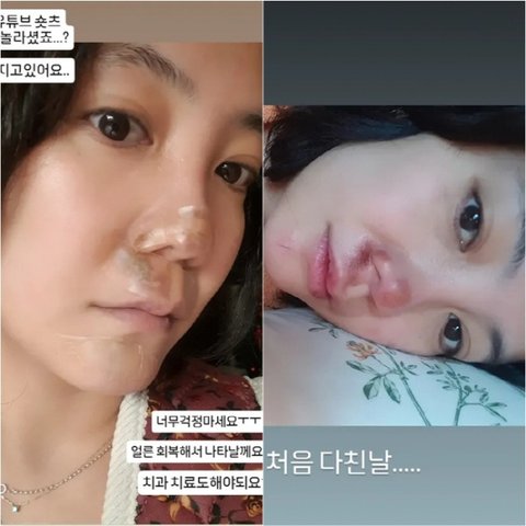 고은아는 26일 자신의 개인 계정에 "처음 다친 날" "방가네 유튜브 쇼츠 보고 많이 놀라셨죠...? 점점 나아지고 있어요. 너무 걱정 마세요. 얼른 회복해서 나타날게요. 치과 치료도 해야돼요"라고 사진을 공개했다. 사진 속 고은아는 코와 인중, 턱 부위에 부상을 당한 모습이다.