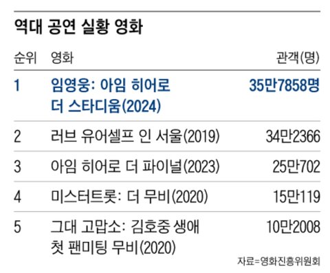 지난해 8월 개봉한 ‘임영웅: 아임 히어로 더 스타디움’(이하 ‘아임 히어로’)은 국내에서 개봉한 공연 실황 영화 중 역대 최고 흥행작이다. 관객 35만7858명, 매출은 101억1714만원이다. 매출 100억원이 넘는 공연 실황 영화는 ‘아임 히어로’가 유일하다
