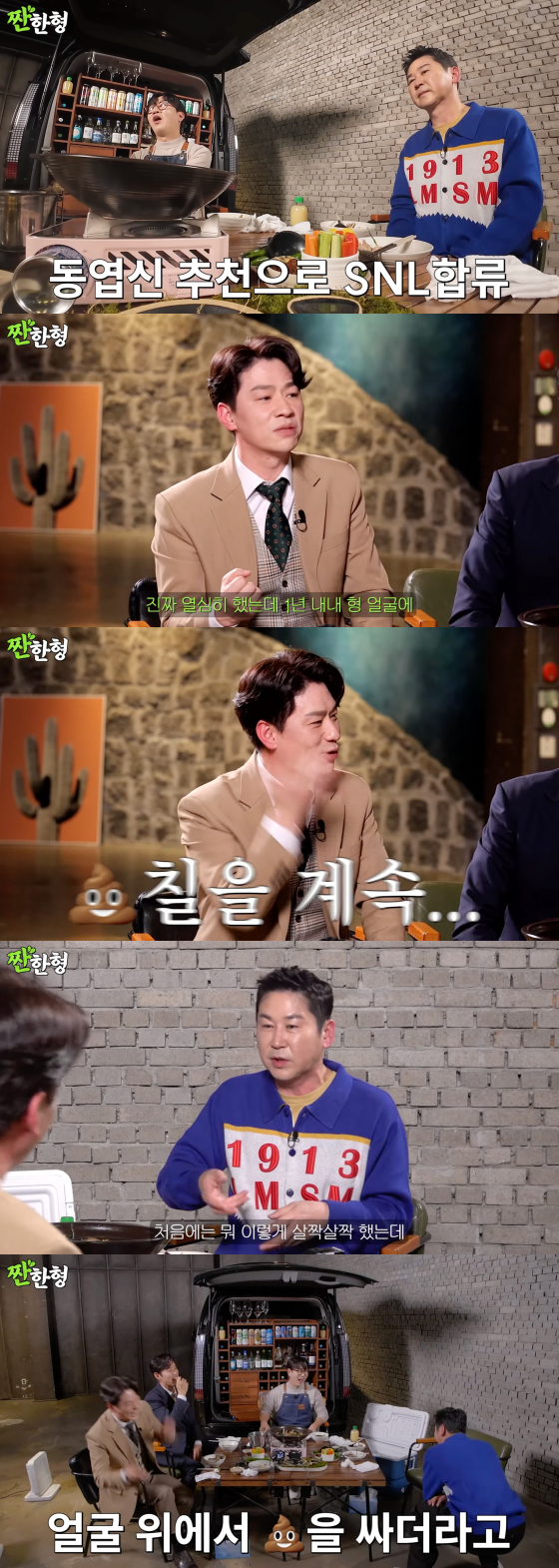 /사진=유튜브 채널 짠한형 신동엽정상훈이 유명세를 얻는 데는 신동엽 공이 컸다고. 정상훈은 신동엽의 추천 덕분에 'SNL 코리아'에 출연하게 된 것을 떠올리며 "정말 열심히 했는데 1년 내내 형 얼굴에 똥칠을 계속했다"고 털어놨다.이에 신동엽은 "똥칠을 처음에는 살짝 살짝하더니 나중에는 내가 누워 있으면 내 얼굴 위에서 똥을 싸더라"고 토로해 웃음을 안겼다.