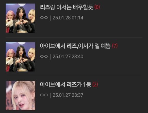 인지도가 안녕즈가 넘사라 그렇지 외모만 본다면 이서,리즈가 황인듯 아예 재능의 영역이라 나머지 멤버들이 따라잡을 수가 없음 물론 취향따라 각자 좋아하는 얼굴이 다를 순 있다고 봄 예를 들어 베이직,정석배우상이면 안유진 좋아하고 화려 트렌디면 장원영 좋아하고 분위기미인이면 가을 귀염상은 레이 이런식으로 근데 진짜 이서,리즈는 취향을 떠나서 걍 진짜 예쁜듯 +이간질이라고 하는 사람들 웃긴다 솔직히 팩트잖아 너네가 그렇게 말하는건 본문내용을 부정이라도 한다는 거임?걍 진짜 더 예쁜 걸 어떡하라고