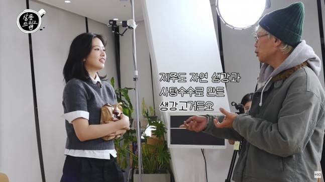 김태호PD는 TEO스튜디오에 온 에그의 딸 안유진에게 특별 선물을 건네며 환영했다. "언제 오나 기다리고 있었다"고 운을 뗀 김PD는 "목 안 좋을 때 드시라고 제주도 자연 생강과 사탕수수로 만든 생강고를 준비했다. 효과 좋다"고 호감을 내비쳤다.