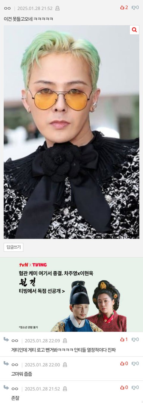 처음엔 팬이니까 그럴수 있다고 생각했는데 지디가 원래 막 존잘도 아니었고 나이도 더 어리고 더 잘생긴 아이돌들 팬도 그 정도로는 올려치기 안 함 자꾸 폼 돌아왔다하는데 흐린한 사진에 옆모습으로 계속 존잘이라고 올려치기 하는것도 과해보이고 그럼 팬들이 보기에도 이전엔 폼이 별로였다는거 아님?