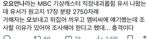 오요안나 MBC 기상캐스터 돌아가셨다는 기사 정치 관련 일로 많이 잠잠했는데 직장 내 괴롭힘과 기사 오보 뒤집어 쓴 유서 발견되고 관심 받고 있어... 아직 모르고 있었다면 꼭 한 번 씩 봐줘