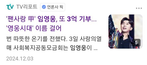지역별 연말 기부성금은 제주영웅시대(물품 300만원), 순천영웅시대웅사랑(446), 영웅시대서부은평방(1000)팬밴드웅기종기(500), 팬밴드웅기종기(300), 영웅시대온기합창단(300), 인천웅S사랑방(300), 영웅시대건행여사방(200), 영웅시대봉사나눔방라온(215), 영웅시대봉사나눔방라온(1200), 포항대구영웅시대(떡국세트 300), 영웅시대제천(라면 50), 영웅시대봉사단(216), 하와이영웅시대(400), 시드니영웅시대(358), 임히어로서포터즈(1000), 영웅시대충북(생수 라면 240), 대구영웅시대대구누보야방(250), 휘드히어로대구경북(방한용품100세트 1000), 영웅시대대구별빛스터디방(700), 영웅시대전국구누야방밴드모임(400), 영웅시대시흥별빛웅바라기(300), 영웅시대광주전남(600), 영웅시대밴드나눔모임(1000), 영웅시대밴드나눔모임9300), 영웅시대밴드나눔모임(150), 평택웅패밀리(300), 영웅시대창원(100), 안동영웅시대(연탄나눔 200), 부산영웅시대(570), 영웅시대서산태안(쌀80포 300), 영웅시대광주전남(김치 200), 영웅시대부산봉사방(500), 영웅시대전북(400), 구리남양주별빛히어로(300), 위드히어로전북영웅시대(379), 포에버웅스터디(616), 영웅바라기서포터즈(이불66채 629), 영웅시대홍천방(315), 영웅시대위드히어로부산금정산(330), 부천서포터즈(500) 등 모두 1억 7655만이다.