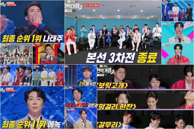 이날 방송에서는 지난주에 이어 본선 3차전 2라운드 ‘뒤집기 한 판’에 나선 나머지 현역들의 무대가 담겼다. 특히 본선 3차전 1, 2라운드 점수를 합산해 11명의 준결승전 진출자가 확정되는 결과 발표에서 상위권과 하위권이 뒤집히는 예측불허 결과들이 등장했다. 3인 1조, 단 1명이 살아남는 데스매치룰을 적용한 ‘패자부활전’에서 극적인 경쟁을 뚫고 3명의 추가 합격자가 탄생됐다.