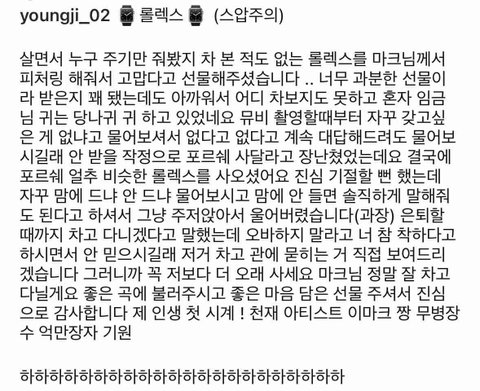 인스타 게시물 쭉 보니까 마크가 영지소녀한테 "프락치" 피처링 해줘서 고맙다고 롤렉스 선물해주다는게 멋지네 영지소녀와 마크의 앞으로도 활동 계속 응원함