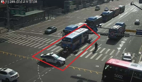 29일 오전 11시 5분께 서울 강남구 강남대로 교보타워사거리에서 오토바이와 시내버스가 추돌했다.