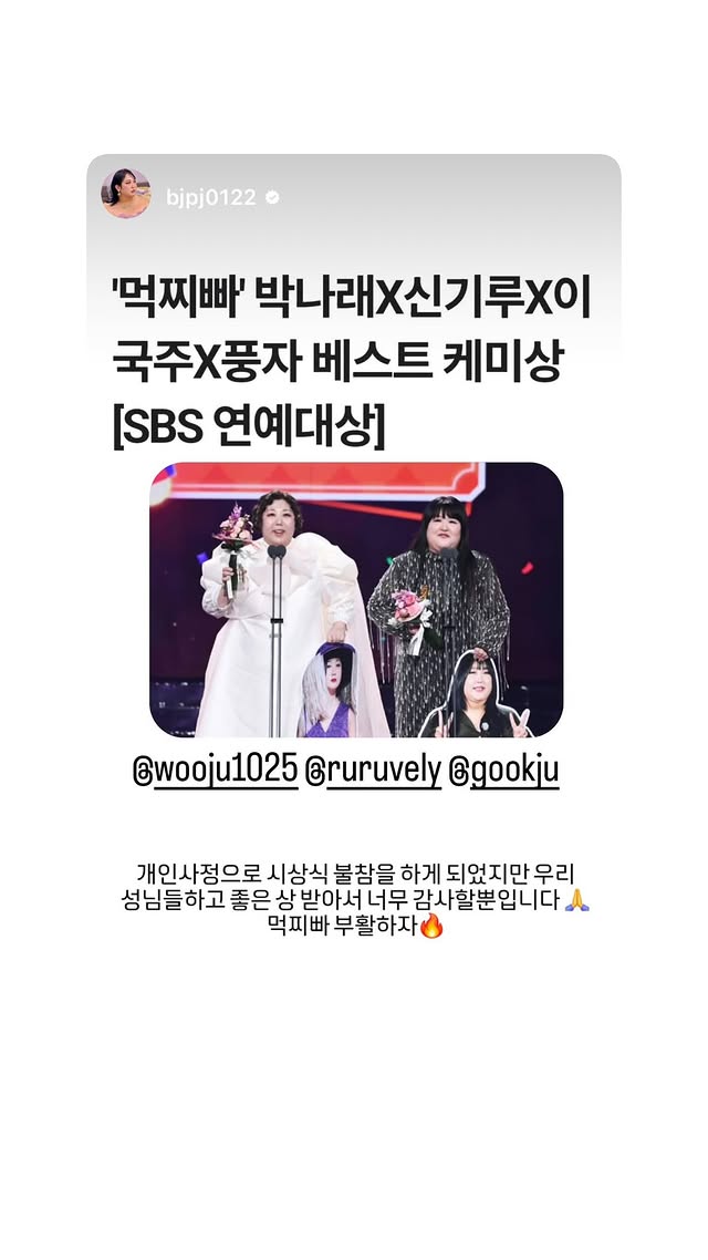 30일 풍자는 "개인사정으로 시상식 불참을 하게 됐지만 우리 성님들하고 좋은 상 받아서 너무 감사할 뿐입니다. 먹찌빠 부활하자"라는 글과 함께 2024 SBS 연예대상 기사를 올렸다.
