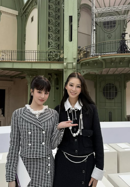 아이린은 배우 고윤정과의 투샷도 공개했다. 고윤정은 화이트 블랙 체크 패턴의 트위드 셋업을 입고 우아한 미모를 과시하고 있다. 163cm로 알려진 고윤정은 아이린과 15cm 차이를 넘어서는 비주얼 합으로 시선을 사로잡았다.