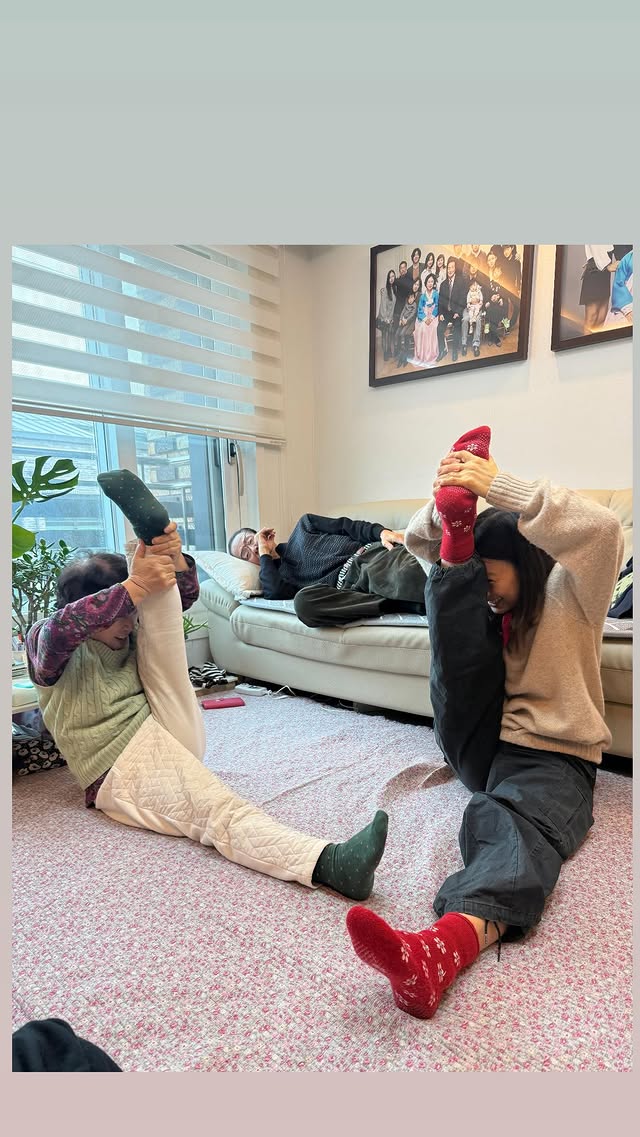 사진 속 이효리는 어머니와 다리를 올리고 스트레칭을 하며 즐거워하고 있다.